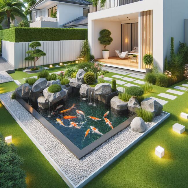 1. Một trong những nguyên tắc quan trọng là tích hợp hồ Koi vào thiết kế tổng thể của sân vườn. Hồ Koi không chỉ là một yếu tố cô lập mà còn là một phần của bức tranh tổng thể. Việc tích hợp hồ vào không gian xanh xung quanh giúp tạo ra sự hòa quyện và cân bằng. Nếu sân vườn có kiểu dáng hiện đại, hồ Koi có thể được thiết kế theo hình elip hoặc hình chữ U để tạo điểm nhấn hiện đại và tương thích với kiến trúc tổng thể. Trong khi đó, trong các khu vườn truyền thống, việc sử dụng kiến trúc kiểu cầu Nhật Bản và các yếu tố trang trí truyền thống sẽ hòa nhập một cách tự nhiên.