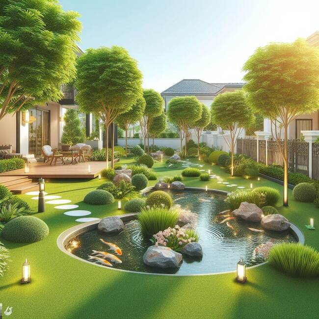 Hồ Koi, như một viên ngọc lấp lánh giữa khu vườn, không chỉ là nơi cho những chú cá Koi đẹp mắt vụng trộm, mà còn là điểm nhấn quan trọng tạo nên sự quyến rũ và phong cách cho sân vườn. Nước trong hồ Koi không chỉ là một phần của cảnh quan mà còn tạo ra âm thanh nhẹ nhàng, như là bản giao hưởng tự nhiên, khiến cho không gian xung quanh trở nên trấn an và ấm cúng.