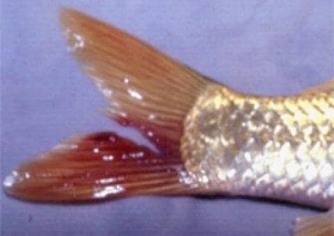 Triệu chứng cá Koi bị bệnh thối đuôi là phần vây đuôi sưng viêm, bong tróc, nặng hơn nữa phần cơ thịt bị hoại từ và thối rữa, gốc vây đuôi ứ máu.