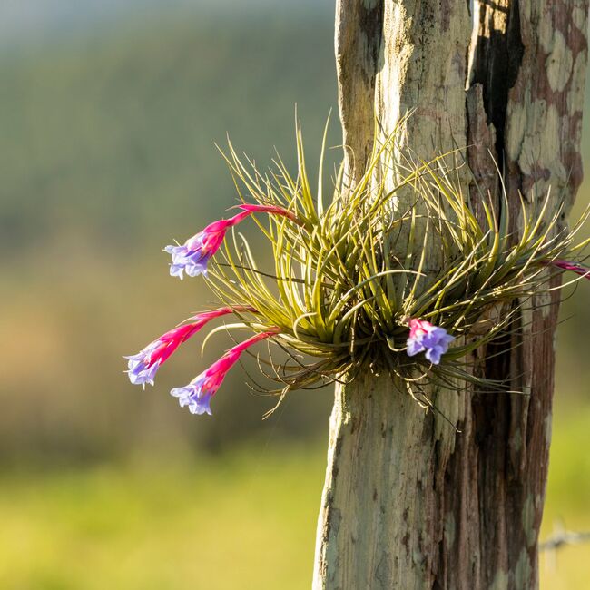 Tillandsia aeranthos bergeri là một trong những loại cây không khí phổ biến nhất với sự nổi bật của những bông hoa rực rỡ. Hoa thường nở vào mỗi mùa xuân với những màu sắc ấn tượng như hồng và xanh lam. Đây là loại cây ít công chăm sóc, và giống như hầu hết các giống Tillandsia, loại cây này thích hợp đặt ở những nơi có ánh sáng gián tiếp hoặc bóng đèn huỳnh quang của văn phòng. Khi cây không khí đang ra hoa, bạn nên tưới nước bằng cách rửa nhẹ chúng dưới vòi nước chảy, thay vì để cây ngập nước vì có thể làm hỏng hoa.