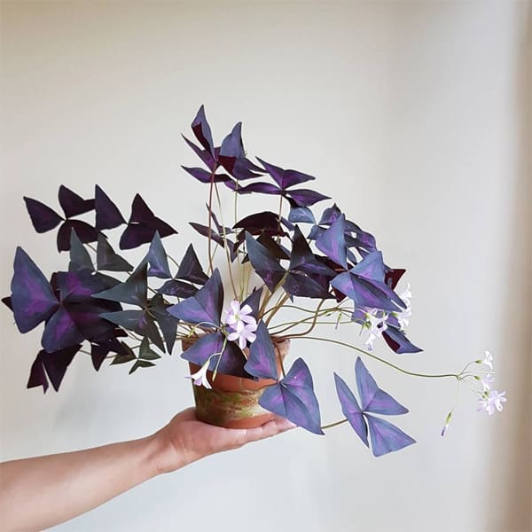 Còn được gọi là cây me chua đất lá tím cùng họ với cỏ ba lá – là một loại cây trồng trong nhà có xuất sứ từ Brazil, được biết đến với màu sắc sống động từ tím cho đến đỏ thẫm của nó. Trong hình là cây có thân dạng củ và có thể nảy mầm trong vòng một tuần, thậm chí có thể nở hoa màu tím oải hương trong vòng 10 tuần. Cây nhìn đẹp hơn nếu được trồng trong chậu sáng màu.