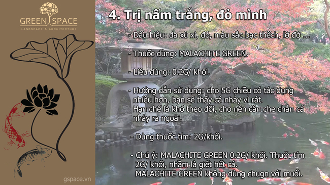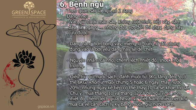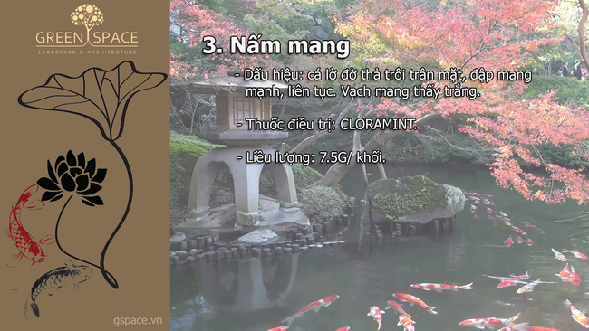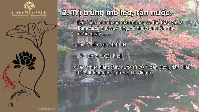 Ngoài việc đầu tư một hệ thống lọc chuẩn cho Koi việc phòng và chữa bệnh cho Koi là điều hết sức quan trọng. Trong quá trình phát triển, các chất thải từ Koi, thức ăn thừa, các sinh vật từ bên ngoài lọt vào... đều có thể dẫn đến việc Koi bị mắc bệnh. Sau đây Greenspace xin tổng hợp một số bệnh hay gặp ở Koi và cách phòng bệnh.