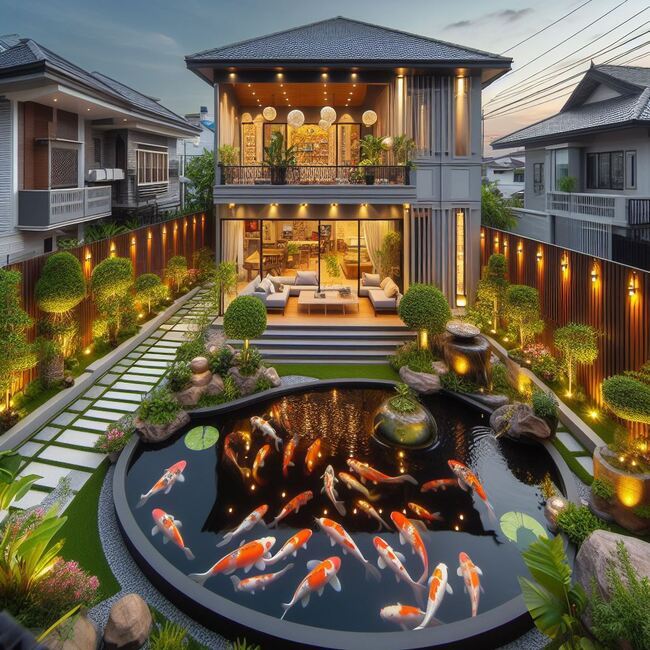 Một ý tưởng sáng tạo trong thiết kế sân vườn và hồ Koi là sử dụng đèn nền dưới bờ hồ, tạo nên bức tranh ánh sáng mềm mại phản chiếu trên bề mặt nước. Đèn này không chỉ làm nổi bật hồ Koi vào buổi tối mà còn tạo ra một không gian lãng mạn, thích hợp cho các buổi tối dạo chơi hay dùng để tổ chức các sự kiện ngoại ô. Việc sử dụng đèn nền còn giúp tạo ra cảm giác sâu rộng, làm tăng sự kỳ bí và huyền bí của hồ Koi, như một chiếc cửa sổ mở ra tới thế giới dưới nước.