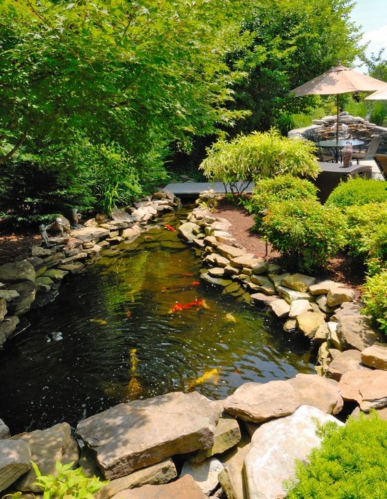 Ngược lại với những thiết kế hồ cá chép Koi trong nhà chính là các thiết kế hồ cá Koi ngoài trời. Đây là loại hồ cá thích hợp với các gia đình có diện tích khuôn viên và không gian bên ngoài rộng. Với hồ cá Koi ngoài trời, bạn có thể thiết kế hồ có kích thước phù hợp với khuôn viên bên ngoài ngôi nhà, nơi có nhiều ánh sáng. Đồng thời, có thể bổ sung thêm các tiểu cảnh như cây xanh, thác nước, bàn ghế, ngọn đèn,…