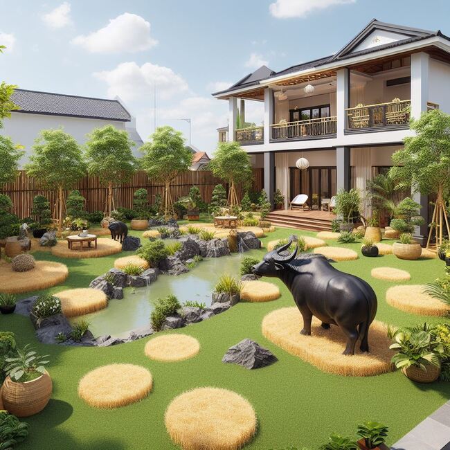 Ngoài ra, các yếu tố văn hóa và tâm linh cũng thường được tích hợp vào thiết kế sân vườn dân gian Việt Nam. Những ngôi đền nhỏ, bàn thờ, và các biểu tượng tôn giáo thường được đặt trong sân vườn để thể hiện sự tôn kính và lòng kính trọng đối với tổ tiên và các vị thần. Điều này tạo ra không gian linh thiêng và thú vị, nơi mọi người có thể tìm thấy bình yên và sự kết nối với tâm linh.