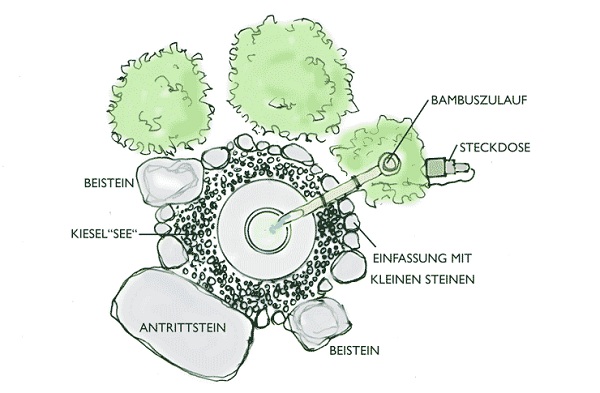Trong khi thiết kế tsukubai cần lưu ý một số những vấn đề sau để đạt được hiệu quả nhất: Cần làm hệ thống chống nước cho hệ thống, hệ thống điện sao cho an toàn, tính toán về áp suất bơm và nước, tiếng ồn (Nếu quá ồn thì bơm sẽ không nghe được tiếng nước. Nên cần tính toán cẩn thận về công suất của máy bơm trước khi lắp đặt. Ngoài ra thì còn cần quan tâm đến lớp che phủ để giấu được hệ thống gọn gàng và tự nhiên.