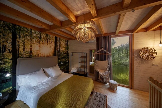 Những phòng nghỉ tại đây được thiết kế chu đáo và tuyệt đối tôn trọng thiên nhiên. Căn nhà gỗ ẩn nấp trong rừng thông, hòa hợp với cảnh quan đến mức hạn chế tối đa phản ứng về thị giác. Nội thất bên trong là sự pha trộn đáng yêu giữa sự mộc mạc và tinh tế, với tông màu kem, những chiếc võng kiểu cách và đồ trang trí bằng vải dệt. Với hai tầng lầu, căn nhà có phòng khách, nhà bếp, phòng tắm, bể sục và những ban công đầy nắng.
