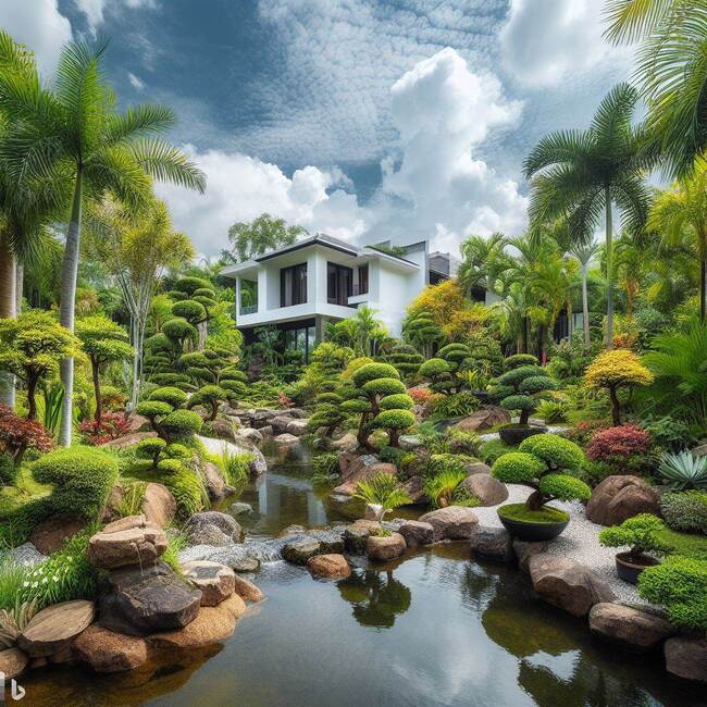 Thiết kế Sân Vườn Kiểu Nhật: Lấy cảm hứng từ kiến trúc và thiên nhiên của Nhật Bản, kiểu thiết kế sân vườn kiểu Nhật tập trung vào sự cân đối, đơn giản và tĩnh lặng. Đá và cỏ được sắp xếp theo một kiểu hình học nghiêm ngặt, và cây cối được trồng một cách tỉ mỉ. Một cây cầu hoặc những viên đá lớn có thể được thêm vào để tạo thêm tính thú vị cho sân vườn.