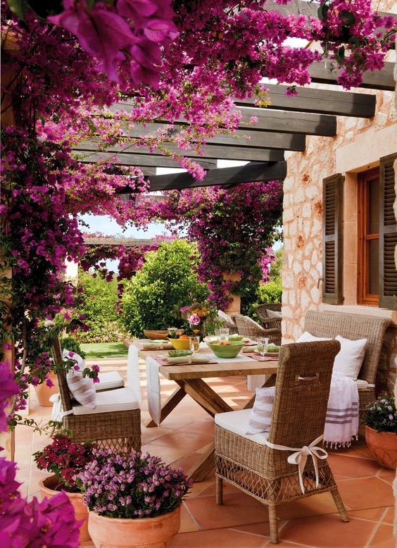 Giàn cây leo được sử dụng khá nhiều cho homestay. Một giàn cây hoa vừa có thể tạo điểm nhấn lại vừa có tác dụng che nắng. Những loại cây thường được sử dụng cho giàn leo: hoa giấy; sử quân tử; rạng đông; mai hoàng yến;...