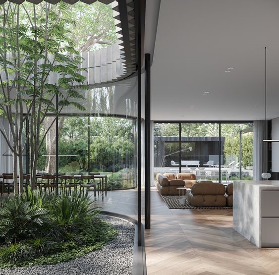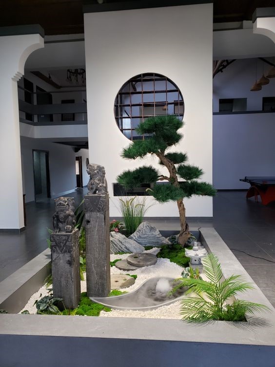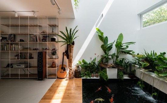 Giếng trời là khoảng không gian thẳng đứng đón nhận ánh sáng trực tiếp từ mái nhà chiếu thẳng xuống nền đất. Đây là nơi cung cấp ánh sáng tự nhiên và luân chuyển không khí. Trong khu vực giếng trời, tiểu cảnh với cây xanh, đá, sỏi…có thể giúp khoảng không gian không còn đơn điệu, ngược lại càng tràn đầy sức sống. Một số giếng trời còn trồng cây trực tiếp xuống nền đất. Nhờ cây có dáng đẹp, vươn thẳng lên cao nên mang lại vẻ đẹp riêng và ấn tượng cho ngôi nhà.