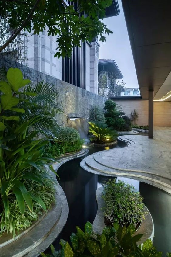 Hòn non bộ, thác nước hay suối nước, tường nước, hồ cá Koi…là những thành phần chính trong thiết kế tiểu cảnh ướt. Nước đóng vai trò chủ đạo và là nguồn mạch chính thu hút tài lộc về mặt phong thủy. Ngoài ra, nước còn điều hòa không khí, cân bằng độ ẩm và giúp không gian sống mát mẻ hơn.Những ngôi nhà có phần trống phía dưới cầu thang thường được tận dụng để thi công hồ cá koi mini, hòn non bộ hay một bể cá sinh thái. Kết hợp thêm tượng trang trí và đá sỏi xung quanh tạo nên một bức tranh hài hòa. Cần lưu ý hệ thống cấp và luân chuyển nước để dòng nước trong hồ luôn được sạch, tránh côn trùng trú ngụ.