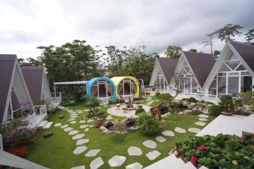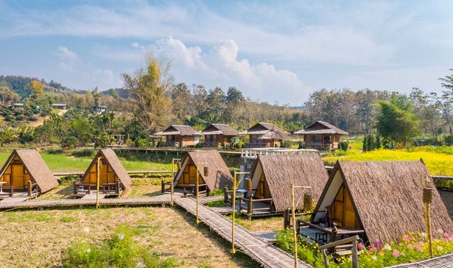 Kiểu mô hình nhà chữ A được xây dựng khá đơn giản kết hợp cùng khuôn viên cảnh quan tự nhiên tạo cảm giác yên bình cho du khách.