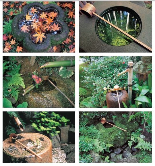 Ở một số khu vườn có trà thất hoặc các khu vườn trà (chaniwa) thường có bồn chứa nước bằng đá dùng để rửa tay. Bồn rửa thường được đặt trước cửa trà thất và được dùng cho nghi thức tẩy rửa trước các buổi tiệc trà truyền thống. Trước khi bước vào trà thất, khách mời phải rửa tay và súc miệng bằng nước trong bồn. Kích thước và hình dạng của bồn rửa cũng rất đa dạng. Có những bồn chỉ đơn giản là một vết lõm tự nhiên trên viên đá hoặc cầu kì hơn là những kiểu bồn được cắt và chạm khắc tinh xảo.