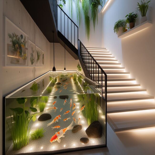 4. Hồ Koi Dưới Cầu Thang: Cầu thang thường là một không gian bỏ trống, nhưng lại có thể trở thành nơi lý tưởng để đặt hồ Koi. Hồ có thể được tích hợp ngay dưới bậc cầu thang, tạo nên một không gian linh hoạt và đầy tính thẩm mỹ. Các bậc cầu thang có thể được thiết kế để dễ dàng quan sát và tận hưởng vẻ đẹp của cá Koi từ mọi góc độ.
