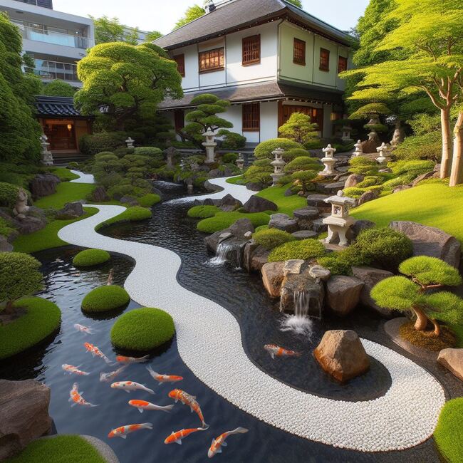Lọc Nước và Sinh Cảnh: Để duy trì sự trong sáng của nước và đảm bảo sức khỏe cho cá Koi, hệ thống lọc nước cần được thiết kế và ẩn dưới các bức đá và cây cỏ thủy sinh. Cây cỏ thủy sinh sẽ tạo nên một môi trường tự nhiên và cung cấp nơi che khuất cho cá. Các cây cỏ như cây sen và cỏ lúa nước có màu xanh tươi sẽ tạo nên một khung cảnh tương tự như bãi cỏ ven suối.
