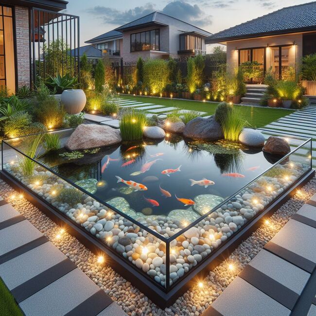 Đối với thiết kế hồ Koi đương đại, vật liệu cũng đóng một vai trò quan trọng. Các kỹ thuật xây dựng mới và vật liệu như kính cường lực, acrylic, hay composite được sử dụng để tạo ra những bức tường trong suốt, làm tăng tính thẩm mỹ và hiện đại cho hồ. Điều này không chỉ giúp người chủ quan sát cá Koi một cách dễ dàng mà còn tạo ra ảnh hưởng thị giác độc đáo, khi ánh sáng mặt trời chiếu qua tạo ra những bóng nước độc đáo trên các bề mặt trong hồ.
