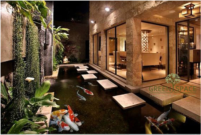 Một yếu tố quan trọng khác là cảnh quan xung quanh hồ Koi. Thiết kế hồ Koi hiện đại thường kết hợp sự tương tác với môi trường xung quanh, tạo ra một không gian sống tích hợp với thiên nhiên. Các khu vườn xanh, đá và cây cỏ được bố trí một cách tự nhiên và hài hòa, tạo nên một bức tranh sống động và độc đáo. Cảnh quan không chỉ làm nổi bật vẻ đẹp của hồ mà còn có ảnh hưởng lớn đến tâm lý và tâm hồn của những người ngắm nhìn. Các loại cây cỏ xanh, hoa lá và cây cảnh được chọn lựa một cách cân nhắc để tạo nên một hòa quyện với không gian xung quanh, làm cho hồ Koi trở thành một điểm nhấn nghệ thuật trong sân vườn.