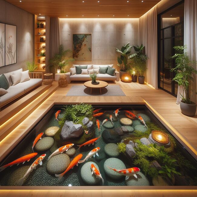 Để bắt đầu, việc chọn lựa đúng vị trí cho hồ Koi là quan trọng nhất. Phòng khách, với sự thoải mái và sự ấm cúng, là lựa chọn lý tưởng. Vị trí này không chỉ tạo ra một trung tâm chú ý trong căn phòng mà còn mang lại cảm giác gần gũi với thiên nhiên. Hồ Koi có thể được tích hợp ngay vào bức tường hoặc trở thành một phần của bàn trang trí, tạo nên một không gian sống độc đáo và tinh tế.