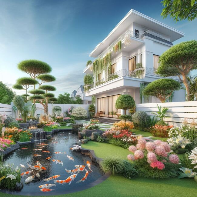 Nước, như một yếu tố không thể thiếu trong thiết kế sân vườn, được tích hợp một cách tinh tế để tạo nên không gian ấn tượng. Hồ nước nhỏ, có thể đi kèm với các tượng đá nhỏ hoặc đèn trang trí, tạo ra một không gian yên bình và trấn an. Âm thanh của nước rơi nhẹ nhàng, kết hợp với hương thơm của hoa lá, tạo ra một trải nghiệm giác quan tuyệt vời, giúp giảm căng thẳng và tạo nên không gian sống ngoại thất lý tưởng.