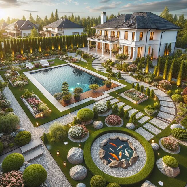 Hồ cá Koi thường là một điểm nhấn quan trọng trong thiết kế sân vườn biệt thự nghỉ dưỡng. Hồ cá Koi không chỉ là nơi chứa những chú cá Koi quý hiếm mà còn làm tăng vẻ đẹp tự nhiên và yên bình của không gian. Việc tích hợp hệ thống lọc và đèn dưới nước tạo ra một không gian thủy sinh sống động và sáng tạo. Các bàn ghế, đèn trang trí, và khu vực nghỉ ngơi xung quanh hồ cá Koi cũng được bố trí sao cho tận dụng được tầm nhìn và tạo ra không gian thư giãn lý tưởng.