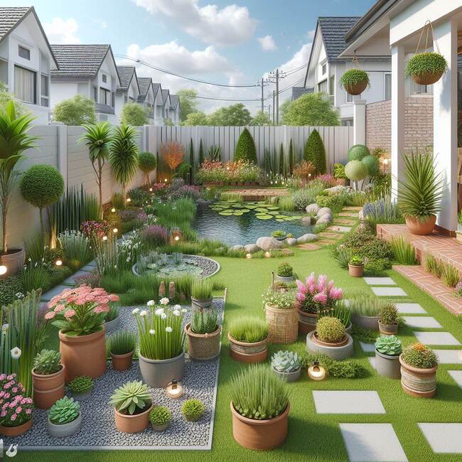 Một trong những xu hướng phổ biến hiện nay là sân vườn độc đáo được trang trí bằng các phần nước sôi và hồ cá. Việc tích hợp nước vào không gian xanh không chỉ tạo ra không khí mát mẻ mà còn làm tăng thêm vẻ đẹp sống động và yên bình. Các hồ cá với những loài cá và thảo mộc nước xanh tạo ra một hệ sinh thái tự nhiên, thu hút sự chú ý và tạo điểm nhấn độc đáo trong sân vườn.