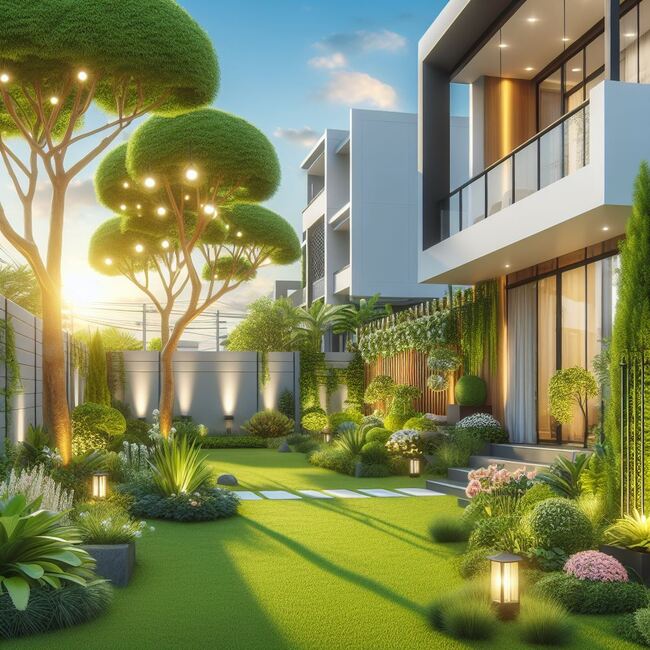 Một trong những yếu tố quan trọng của thiết kế sân vườn đơn giản là việc chọn lựa cây cỏ và cây cảnh quan phù hợp. Các loại cây có hình dáng và kích thước đơn giản thường được ưa chuộng, như cây thông Nhật Bản, cây cỏ lá mảnh, hoặc cây bụi trang trí. Màu xanh mát từ lá cây tạo nên bức tranh tĩnh lặng, làm dịu đi không khí xung quanh và tạo ra sự thoải mái cho người sống trong không gian đó.
