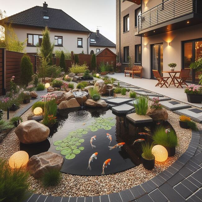 Trong quá trình xây dựng, sự chọn lựa về vị trí của hồ Koi đóng vai trò quan trọng, không chỉ để tối ưu hóa tầm nhìn mà còn để tạo ra một khu vực thư giãn hiệu quả. Hồ Koi thường được đặt ở nơi có ánh sáng tốt, giúp những chú cá nổi bật dưới tác động của ánh nắng mặt trời, tạo nên bức tranh sống động giữa cây xanh và nước biếc.
