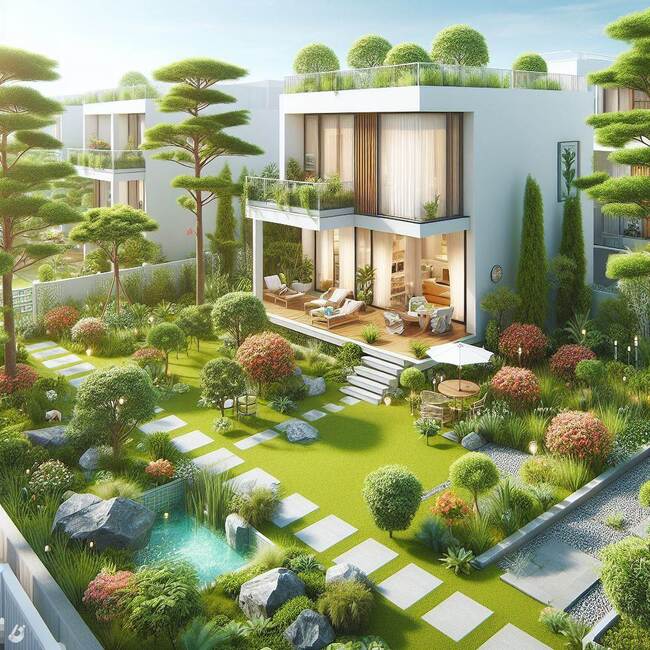 Khi thiết kế sân vườn kết hợp tiểu cảnh, sự sáng tạo không có giới hạn. Các yếu tố như bức tường cây xanh, giàn hoa hay thảm cỏ nhân tạo có thể được tích hợp để tạo ra không gian sống xanh mát và tận dụng tối đa diện tích. Việc sắp xếp các loại cây cỏ theo chiều cao và màu sắc cũng giúp tạo nên cảm giác chiều sâu và phức tạp cho sân vườn.