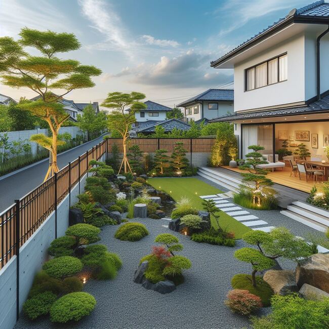 Nguyên tắc cơ bản của thiết kế sân vườn kiểu Nhật là sự cân bằng và hài hòa. Tính chất tự nhiên của môi trường được tôn vinh thông qua việc sử dụng các yếu tố như đá, nước, cây xanh và hoa. Đá và cỏ xanh mịn tạo nên bức tranh tĩnh lặng, trong khi nước chảy nhẹ nhàng qua các hòn đá, tạo nên âm nhạc dịu dàng, làm dịu đi không khí xung quanh.
