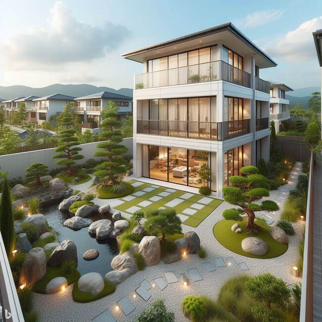 Một trong những đặc điểm nổi bật của thiết kế sân vườn kiểu Nhật là sự cân nhắc kỹ lưỡng về sự cân bằng và phối hợp giữa các yếu tố. Các đường cong của hồ cá Koi, những con đường đi bộ nhỏ nhẹ, và bố cục cây cỏ xanh mướt được sắp xếp theo một cách hài hòa, tạo nên một bức tranh sống động, tràn ngập yên bình. Mỗi góc nhỏ trong sân vườn đều là một tác phẩm nghệ thuật riêng biệt, từng kết cấu cây lá, đến các chi tiết nhỏ như đá trang trí và đèn đường.