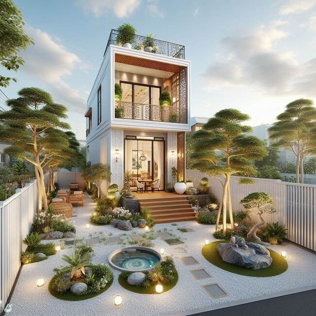 Nước, một yếu tố quan trọng trong thiết kế sân vườn, cũng được tích hợp một cách khéo léo. Đài phun nước nhỏ, hồ cá mini hay thậm chí là một hệ thống nhỏ đường nước chảy dọc theo đường đi có thể tạo nên âm thanh nhẹ nhàng và tăng thêm vẻ sinh động cho không gian xanh của sân vườn.