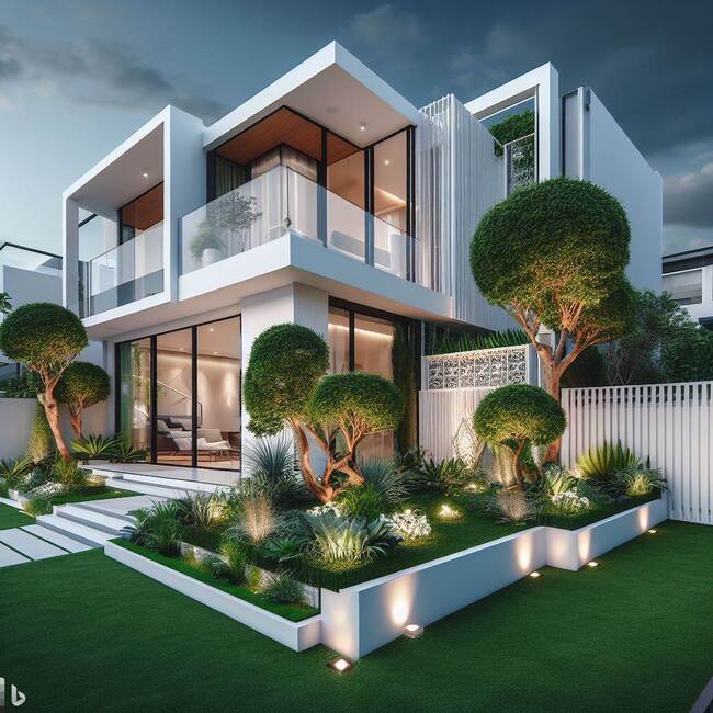 Cây cảnh trong sân vườn hiện đại thường được chọn lọc một cách cẩn thận để tạo nên một hình ảnh hoàn hảo. Cây xanh được đặt ở những vị trí chiến lược, tôn lên vẻ đẹp của không gian xung quanh và tạo điểm nhấn cho toàn bộ thiết kế. Các loại cây có hình dáng độc đáo và lá xanh mát thường được ưu tiên, tạo nên một bức tranh sống động nhưng vẫn giữ được sự thanh lịch.