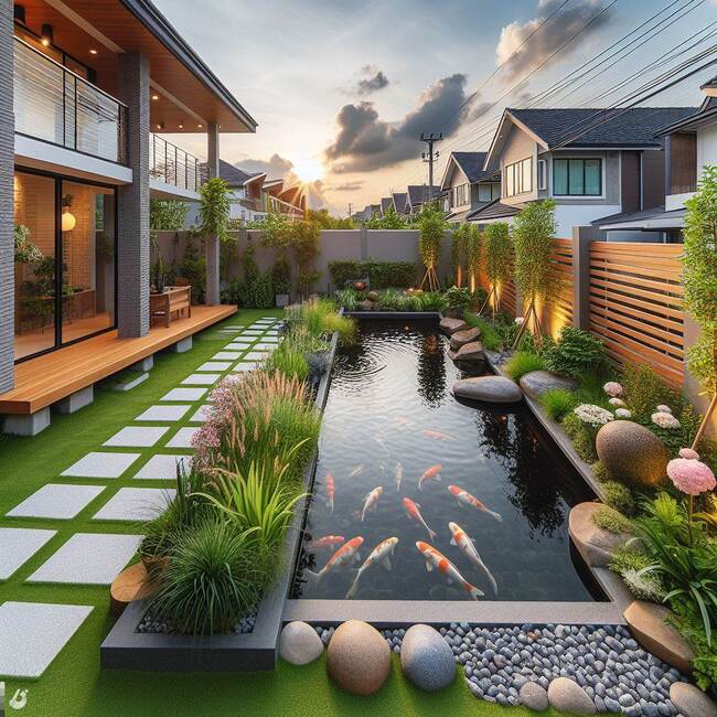 Kiểu thiết kế "sân vườn nước" cũng là một ý tưởng độc đáo để tận dụng không gian nhỏ. Bạn có thể tạo ra một hồ nước nhỏ với đá trang trí và cỏ xanh quanh hồ để tạo nên không gian thanh lịch và tinh tế. Việc đặt những bức tường nhỏ gần hồ có thể tạo ra âm thanh nước nhẹ nhàng và tạo điểm nhấn âm nhạc tự nhiên cho sân vườn. Sử dụng đèn dưới nước để chiếu sáng hồ vào buổi tối, tạo nên không gian sống ngoại thất tuyệt vời và thuận lợi cho những buổi hẹn hò cuối ngày.