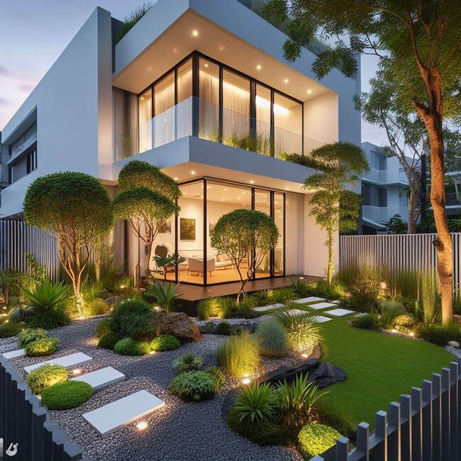 Công nghệ chiếu sáng thông minh cũng là một yếu tố quan trọng trong thiết kế sân vườn hiện đại. Đèn led có thể điều chỉnh màu sắc và độ sáng, tạo ra không gian ánh sáng linh hoạt và tinh tế. Hệ thống chiếu sáng thông minh giúp tạo ra không gian vườn phong cách vào buổi tối, tạo điểm nhấn cho các khu vực đẹp của sân vườn và tạo ra không gian thư giãn vào cuối ngày.