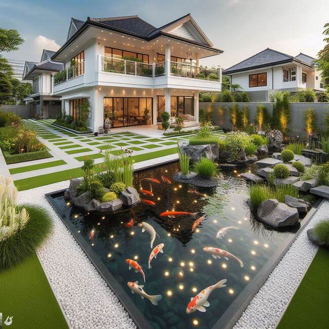 Một khía cạnh quan trọng không thể thiếu trong tiêu chuẩn thiết kế hồ Koi đẹp là tích hợp yếu tố văn hóa và nghệ thuật. Sử dụng các yếu tố như cây cầu kiểu Nhật Bản, đèn lồng truyền thống hay các tượng trang trí có thể tạo nên bức tranh hài hòa, làm cho hồ Koi trở thành một nơi không chỉ là nơi ở của cá mà còn là tác phẩm nghệ thuật độc đáo.