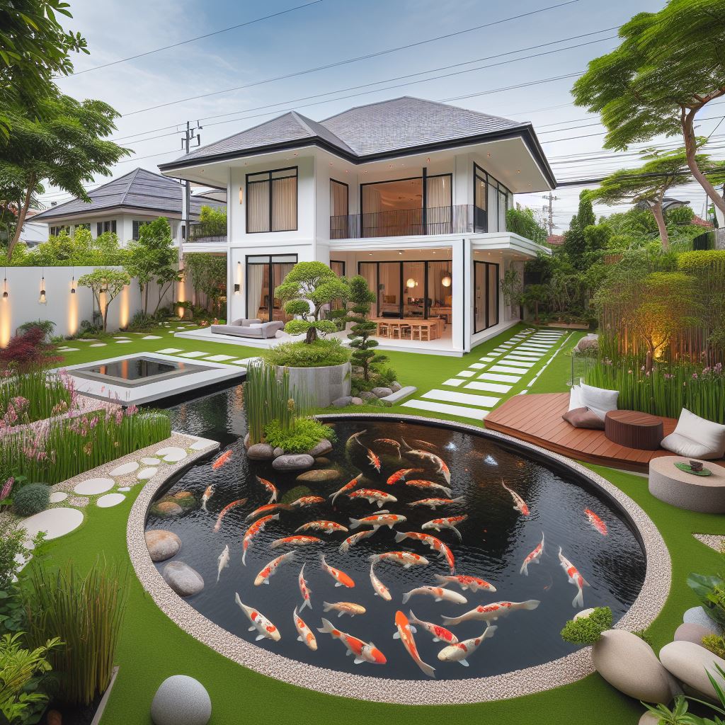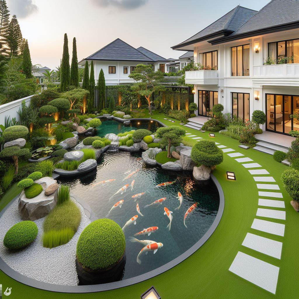 Thiết Kế Hồ Koi Gương Mặt Nghệ Thuật: Sự Phối Hợp Hoàn Hảo Của Nước, Cây Cỏ và Đá, với từ khóa "thiết kế hồ Koi