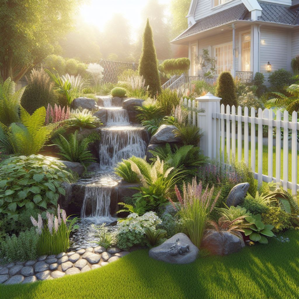 Thiết kế sân vườn kết hợp với thác nước là một biểu tượng của sự hòa quyện giữa thiên nhiên và kiến trúc, tạo ra một không gian sống đẹp và thú vị, nơi âm thanh của nước và vẻ đẹp của cây cối gặp nhau, tạo nên một môi trường tĩnh lặng và phong cảnh đáng ngạc nhiên.