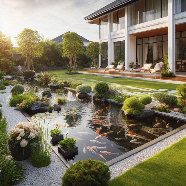 Thiết kế sân vườn kết hợp hồ Koi đòi hỏi sự tinh tế và sáng tạo. Việc chọn vị trí và hình dạng của hồ cần được xem xét kỹ lưỡng để hòa hợp với kiến trúc tổng thể của biệt thự. Hồ Koi thường được bố trí gần cửa sổ hoặc ban công để bạn có thể ngắm nhìn cá Koi từ bên trong nhà. Đá và cây cỏ xung quanh hồ cũng được sắp xếp để tạo cảm giác hài hòa và tự nhiên.
